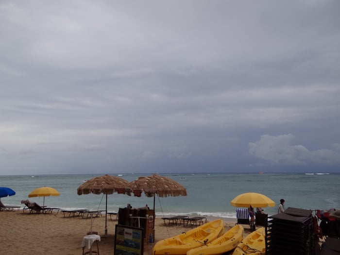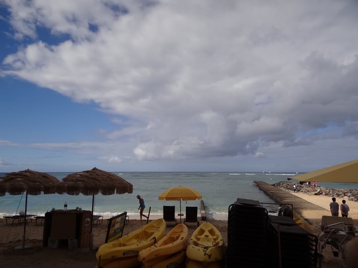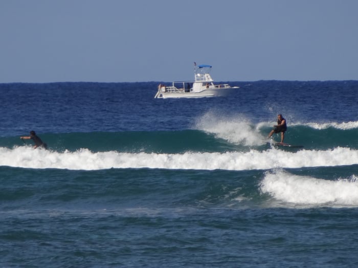 今朝は風は強いけど、晴天。 波は小さいです(^o^;) Hurricane Madelineは勢力を落としてトロピカルストームになり、 進路予想図ではオアフはそんなに近くありませんが、 その次のHurricane Lesterは予想図だとオアフにも進んで来そうですね。 週末は雨かも・・・(T T)