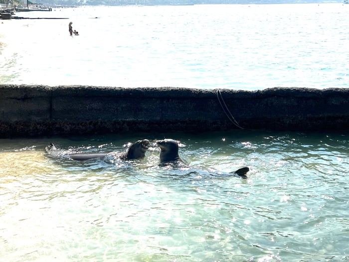いつもはビーチでお昼寝姿のモンクシールですが 今朝は2頭でスイミングデート。 ずっとクルクル、クルクル回りながら一緒に泳いでて ラブラブ♡ こんな姿はなかなか見られません。 周りのビジターから、歓声が上がってました。