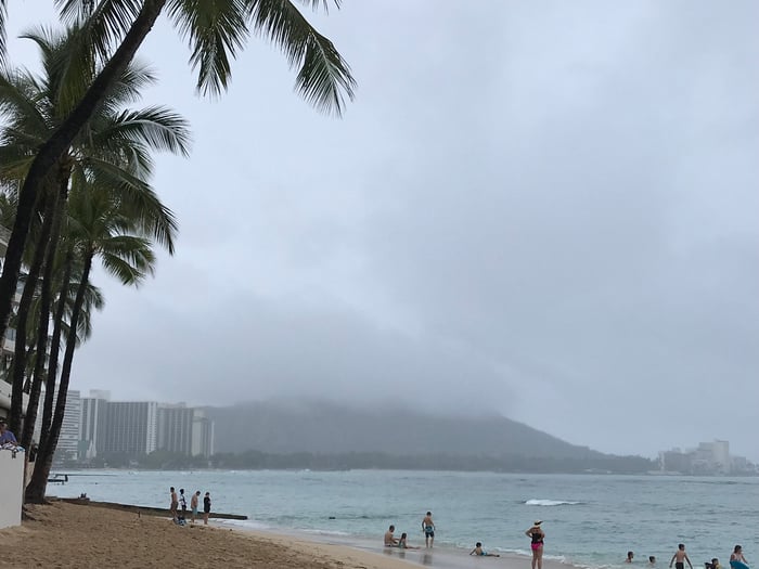 今日は明け方に雷の音で目が覚めました。 ダイヤモンドヘッドも白く厚い雲に覆われています。 午後は雨も強くなって来ました。