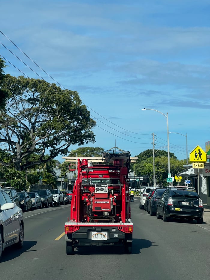 最近よく見かける右ハンドル車 これは日本の消防車 ホースもついたまま。 サーフボード乗せて走ってます(^ ^) 注目度は抜群(^ ^)