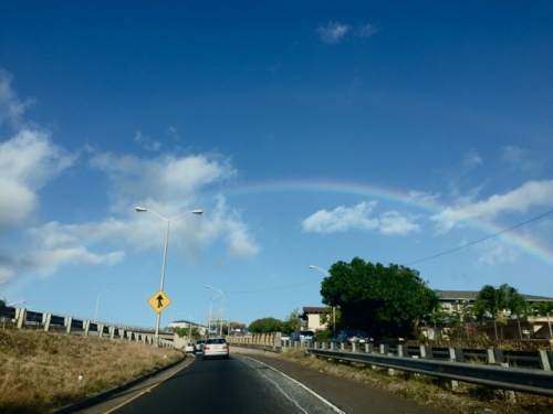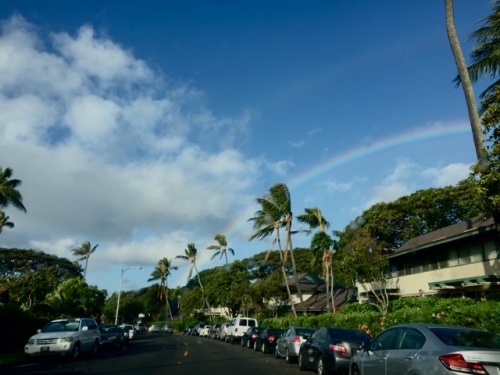 今朝、家を出たらシャワーがさっと降って虹が出ました。