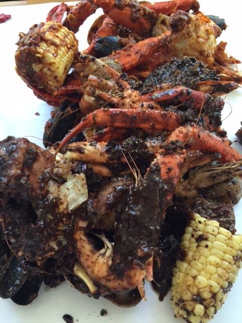 スパイシーなケイジャンソースのシーフードを手掴みで食べるのは