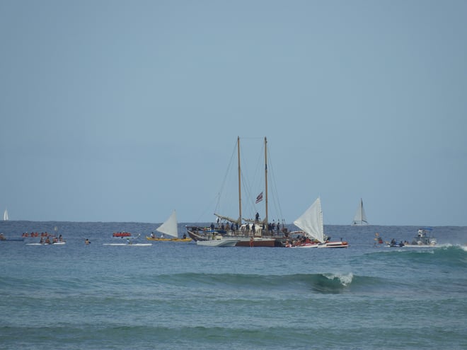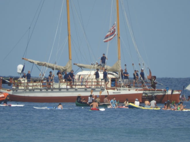 Hokuleaがマジックアイランドに近づくと、歓声が海の中まで聞こえて来ました。