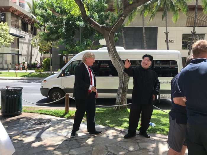 カラカウア通りを歩く人に手を振ったり、二人仲良く肩を組んだりしていました。