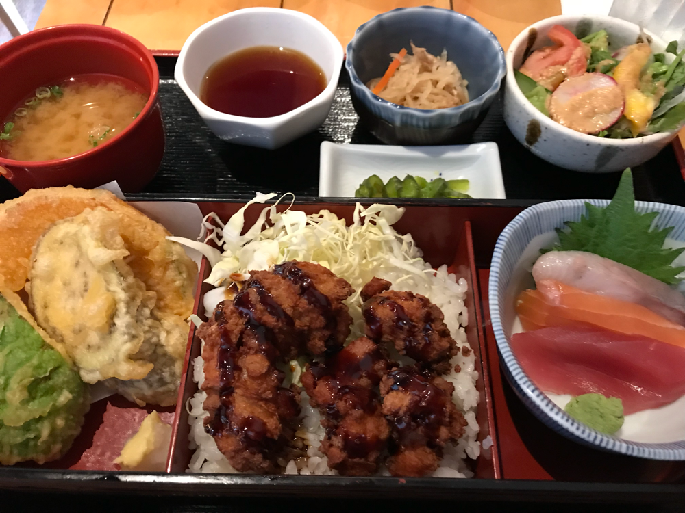 01/28/2018 桜テラス キングストリートの桜テラス ランチタイムは、ローカルのお年寄りで いっぱいでした(^^) 刺身に天ぷらに唐揚げの 盛りだくさん。 天ぷらの分厚さはアメリカ〜ン(^^;) tagPlaceholderカテゴリ: jan2018