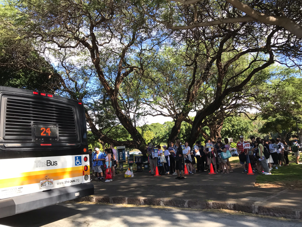バスやトローリーに乗る人達が並んでます。
