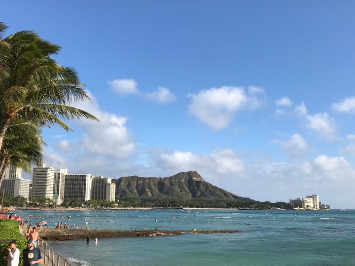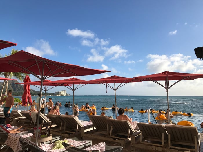 沢山の人が太陽と海を楽しんでいます。