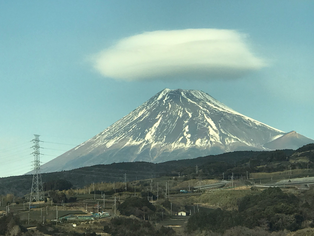 大きな雲がかかった富士山を見ながら、