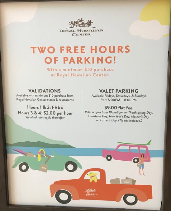 $10以上のショッピングか食事で2時間パーキングがFree !!