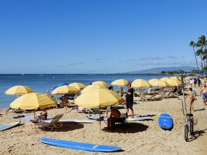 このビーチのパラソルの多さと