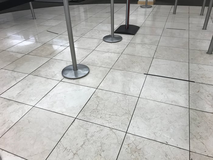 銀行に行ったら、並ぶ列のところに6feetずつの線が引いてあって