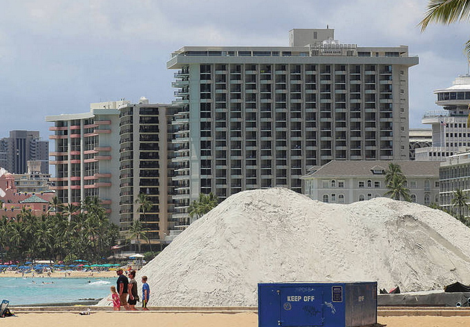 ワイキキビーチに今から撒かれる砂の山。