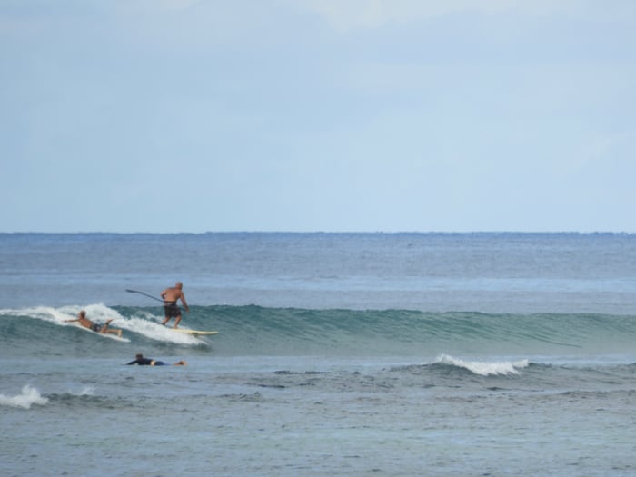 グレートホワイトシャークがサーファーの親子のすぐ側に (@@)