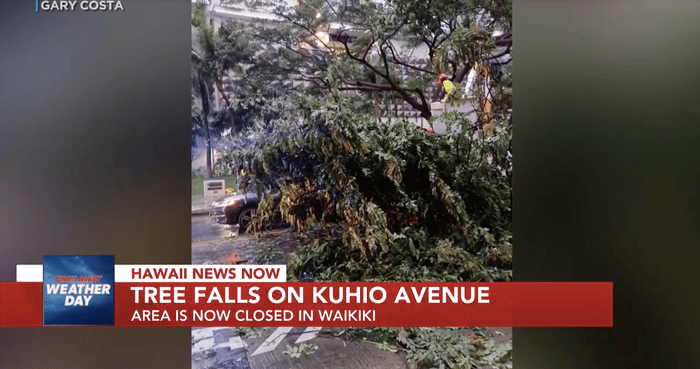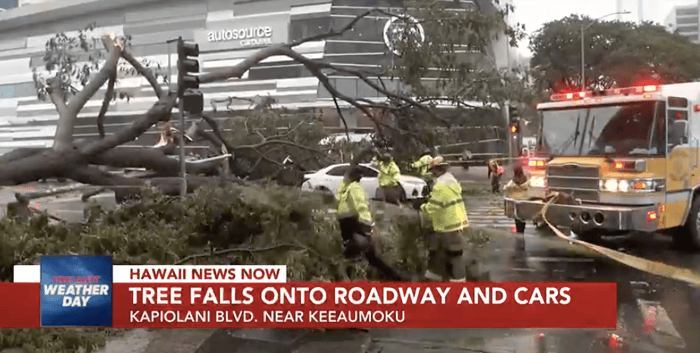ストームの影響で大木が倒れ、走行中の車に当たる事故。